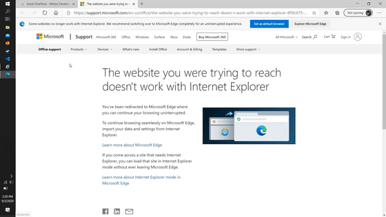Thông số kỹ thuật mới này đã được thử nghiệm trong phiên bản 84 Edge được phát hành vào tháng 7/2020, nhưng sẽ được kích hoạt cho tất cả người dùng trong phiên bản 87 Edge dự kiến phát hành vào tháng 11 tới. IE tải tệp thông qua một plugin, sau đó sẽ theo dõi những trang web bạn đang truy cập thông qua trình duyệt. Khi bạn điều hướng đến một trang mà Microsoft không muốn người dùng truy cập qua IE, trang hỗ trợ với thông báo sau sẽ xuất hiện: