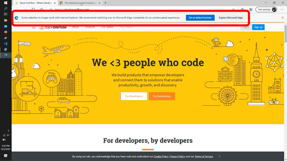 Nếu người dùng cố gắng truy cập theo cách cũ, ngay sau khi trình duyệt IE tải trang web, Edge sẽ tự khởi chạy và mở trang web này ra. Ở đầu tab sẽ xuất hiện thông báo hướng dẫn cho biết: "Nên sử dụng Edge vì một số trang web không thể mở bằng Internet Explorer".