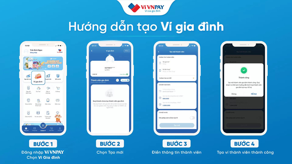 Hướng dẫn cài đặt Ví gia đình trên ví VNPAY: Bước 1: Đăng nhập ví VNPAY, chọn Ví gia đình. Bước 2: Chọn Tạo mới. Bước 3: Điền thông tin thành viên. Bước 4: Tạo ví thành viên thành công. ![]() |