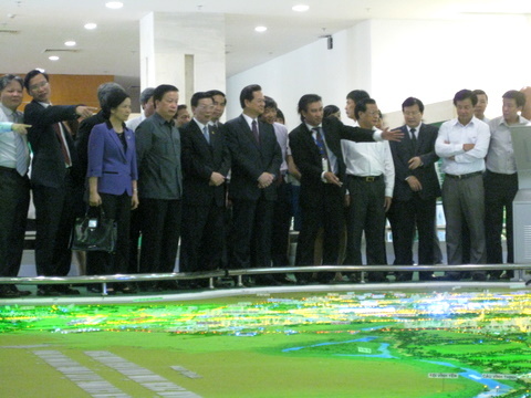 Thủ tướng Chính phủ cùng Lãnh đạo Bộ Xây dựng, UBND Thành phố Hà Nội cùng xem mô hình quy hoạch Hà Nội