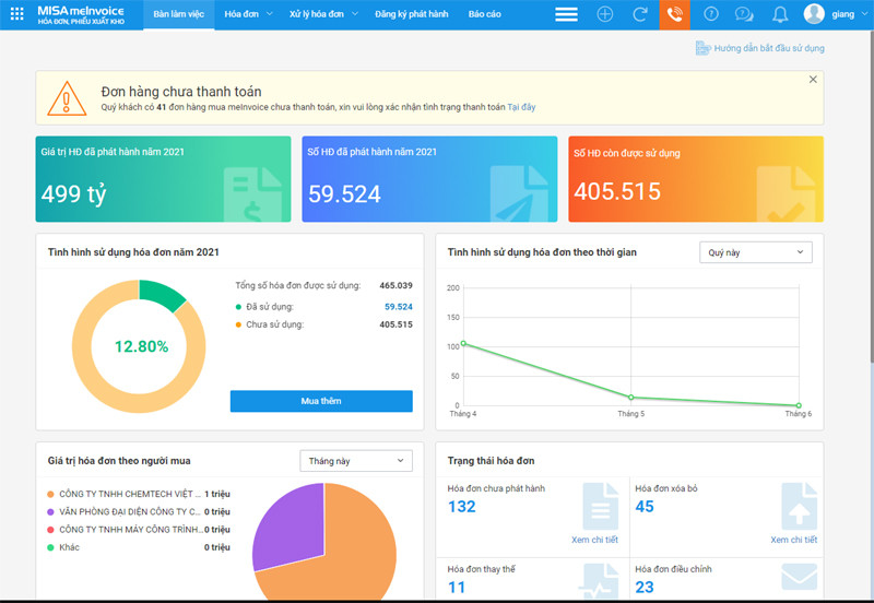 Hóa đơn điện tử MISA meInvoice được xây dựng đáp ứng đầy đủ nghiệp vụ theo Thông tư, Nghị định của Tổng Cục Thuế. Phần mềm cho phép người dùng thực hiện phát hành, quản lý, báo cáo hóa đơn mọi lúc, mọi nơi qua mobile, website, desktop. Mặt khác, phần mềm còn giúp kế toán viên cũng như kế toán trưởng, giám đốc tài chính theo dõi, quản lý tình hình sử dụng hóa đơn một cách nhanh chóng, chính xác thông qua các báo cáo, biểu đồ trực quan. Qua đó, doanh nghiệp sẽ kịp thời xử lý được thông tin bán hàng, đẩy nhanh quá trình giao dịch kinh doanh.