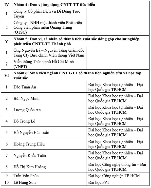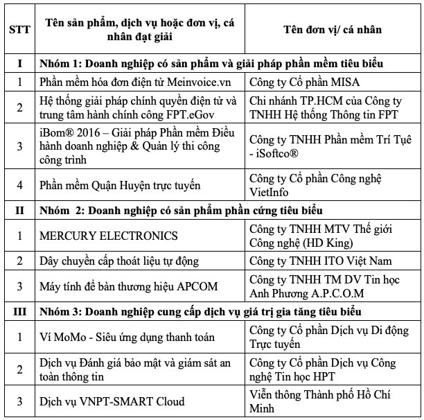 Các doanh nghiệp, cá nhân được Giải thưởng CNTT-TT TP.HCM 2018. |