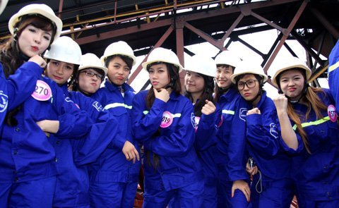 Những chị công nhân làm việc tại khu mỏ cũng tỏ thích thú và bất ngờ trước vẻ đẹp của các thí sinh.