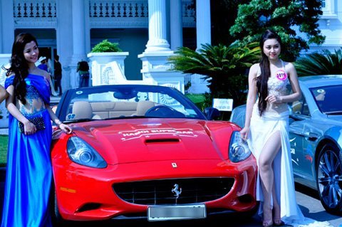 | Thanh Thùy và Thy Thơ bên chiếc xe mui trần Ferrari California. |