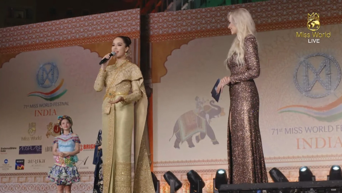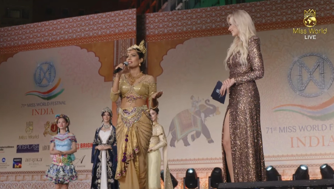 Hoa hậu xứ Wales chọn váy truyền thống đơn giản, hô tên hùng hồn và nhận được sự ủng hộ nồng nhiệt từ người hâm mộ. Trước đó, cô gặp tại xe nghiêm trọng dẫn đến gãy xương cổ và xương chậu.Xuất hiện trong trang phục truyền thống của Ấn Độ, người đẹp Sini Shetty khoe nhan sắc ngọt ngào, nụ cười trong trẻo.