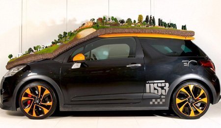 | Citroen DS3 với mô hình đường đua trên nóc xe. |