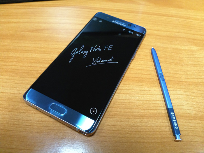 | Galaxy Note FE chính hãng được bán ở Việt Nam có hai phiên bản gồm đen xám và xanh san hô. Chiếc Galaxy Note FE chính hãng mà phóng viên VietNamNet có trên tay là phiên bản màu xanh san hô (Blue Coral). Đây là phiên bản từng được đánh giá cao về thiết kế của chiếc Galaxy Note 7. |