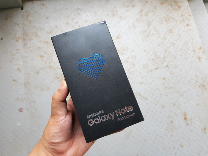 | Galaxy Note FE với vỏ hộp có logo hình trái tim xanh cùng dòng chữ Galaxy Note Fan Edition. |