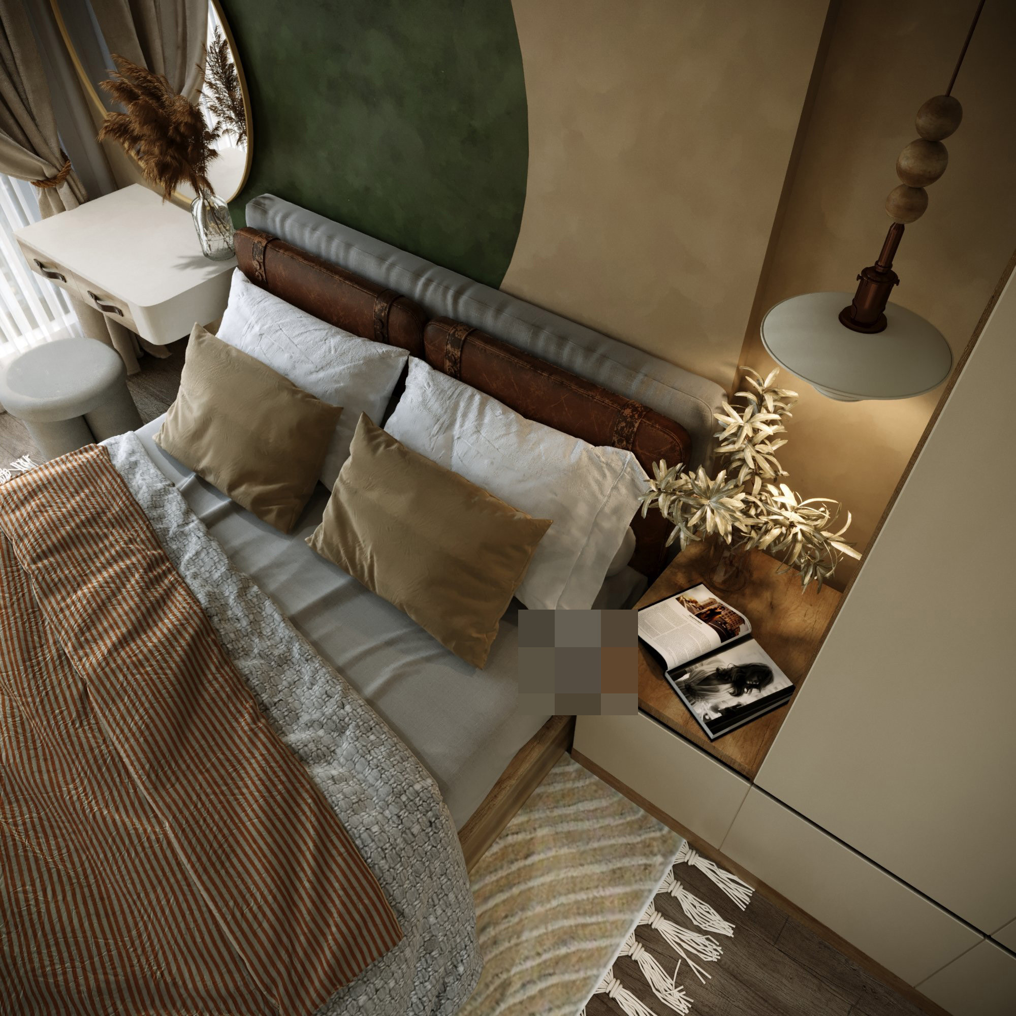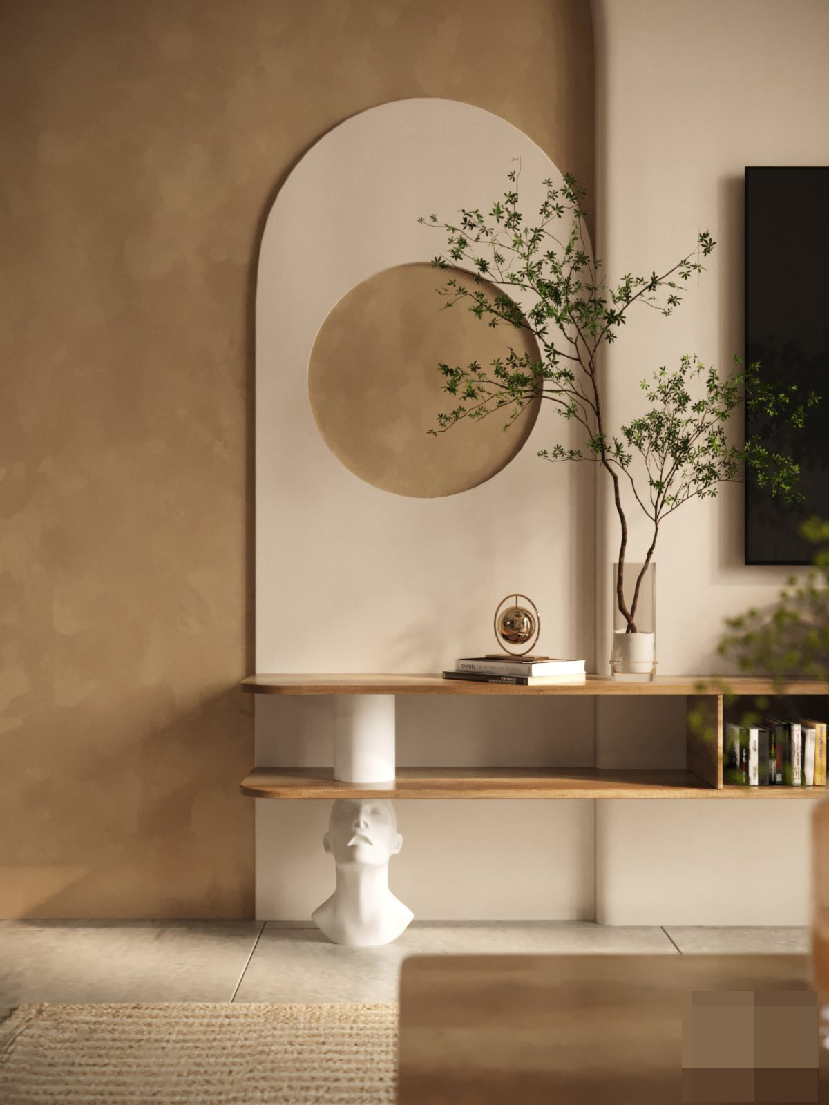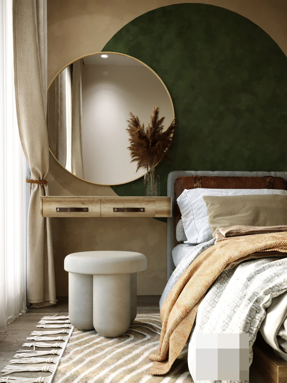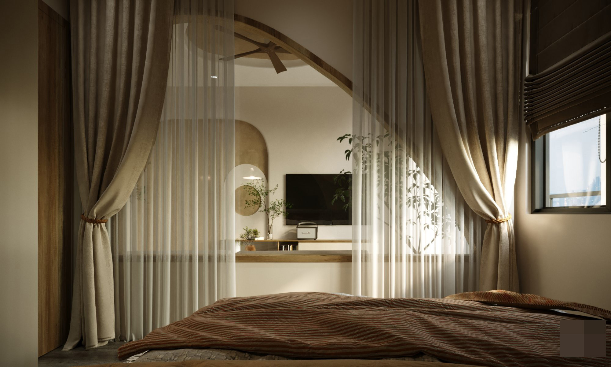 Đường nét thiết kế đơn giản nhưng ấn tượng và đầy phong phú. Chiếc kệ tivi bằng các đợt gỗ với chân trụ hình tượng người độc đáo. Cây xanh nhỏ là yếu tố phong thủy, hợp với bản mệnh gia chủ, đồng thời là mảng màu tươi tắn cho toàn bộ không gian. Phần tường sơn hiệu ứng bê-tông chính là điểm nhấn cho khu vực này. Phạm Huệ đã dùng mảng tường kính bo cong, giúp phòng ngủ mở rộng về mặt thị giác, tận dụng được ánh sáng từ phòng khách. Sàn nhà dùng gạch giả bê-tông chống trơn trượt để tạo nét hoài cổ. Loại sàn này trên thị trường có nhiều chủng loại, mẫu mã, chất lượng khác nhau. Tuy nhiên chị tư vấn, gia chủ nên chọn loại dày dặn, có độ bám dính tốt. Vì chọn loại rẻ, gạch mỏng dễ vỡ và khá trơn, gây nguy hiểm trong quá trình sử dụng.