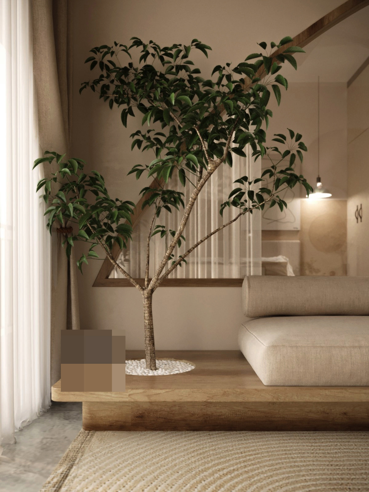 Sofa gỗ kết hợp chậu trồng cây. Một số ý kiến cho rằng trồng cây như vậy sẽ ảnh hưởng đến sự bền vững của ghế do phải tưới nước, gây ẩm mốc..., cây kém phát triển, khó chăm sóc... Phạm Huệ chia sẻ, ở đây có 2 phương án: Phương án 1: Trồng cây giả, không tốn công chăm sóc, không phải tưới nước.... nhưng nhìn kém sinh động. Phương án 2: Trồng cây thật, gia chủ lựa chọn loại cây tưới ít nước, phù hợp bóng mát, trồng được trong nhà. Phần khoang trồng cũng được làm rộng ra, để chứa lượng đất phù hợp cho cây sinh trưởng.