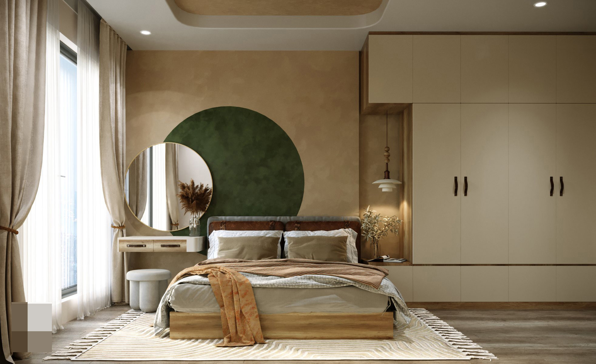 Phòng ngủ master bố trí nội thất dọc theo phòng, tạo khoảng không rộng rãi, thoáng đãng. Không gian có nhiều điểm nhấn như: Trần thạch cao giật cấp, sơn hiệu ứng, mảng tường đầu giường. Tủ quần áo tích hợp cả tab đầu giường, tiết kiệm diện tích.