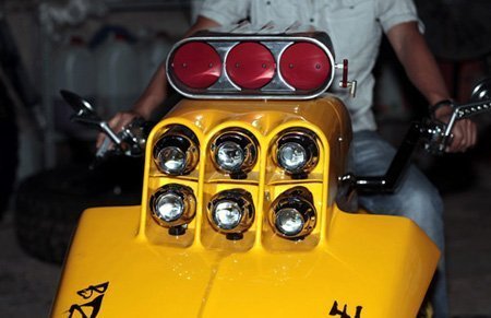 Ngoài hộp số tự động như ô tô thì “khủng long chúa” còn được trang bị thêm hộp số de giúp xe có thể di chuyển lùi về sau rất linh hoạt. Sau khi độ lần hai thì dàn đèn 6 bóng cả cos và pha nằm hai bên đã được đem lên phía trên mui xe phát sáng cả khu vực. Ngoài ra, bên cạnh hai bên bánh xe trước được trang bị thêm hai dải đèn LED đa màu sắc, tạo cho xe long lanh hơn khi di chuyển trên đường.