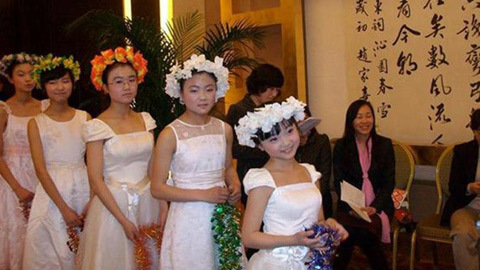 | Lâm Diệu Khả (đứng đầu) bị báo giới để ý khi cô bé xuất hiện với vòng một có phần "nảy nở" hơn nhưng bậc đàn chị đứng cùng (Ảnh: Sina) |