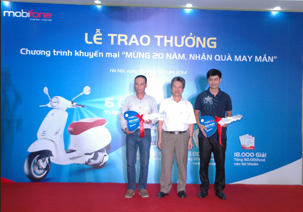 Chương trình khuyến mại”Mừng 20 năm, nhận quà may mắn” của MobiFone diễn ra từ ngày 03/06 đến 31/08/2014 với tổng giá trị giải thưởng lên tới hơn 1,8 tỷ đồng, trong đó 6 giải Nhất, mỗi giải là xe máy Vespa Primavera 125 3V i.e, 60 giải Nhì, mỗi giải là điện thoại Samsung Galaxy Trend Plus và hàng nghìn giải cộng tiền vào tài khoản cho khách hàng.