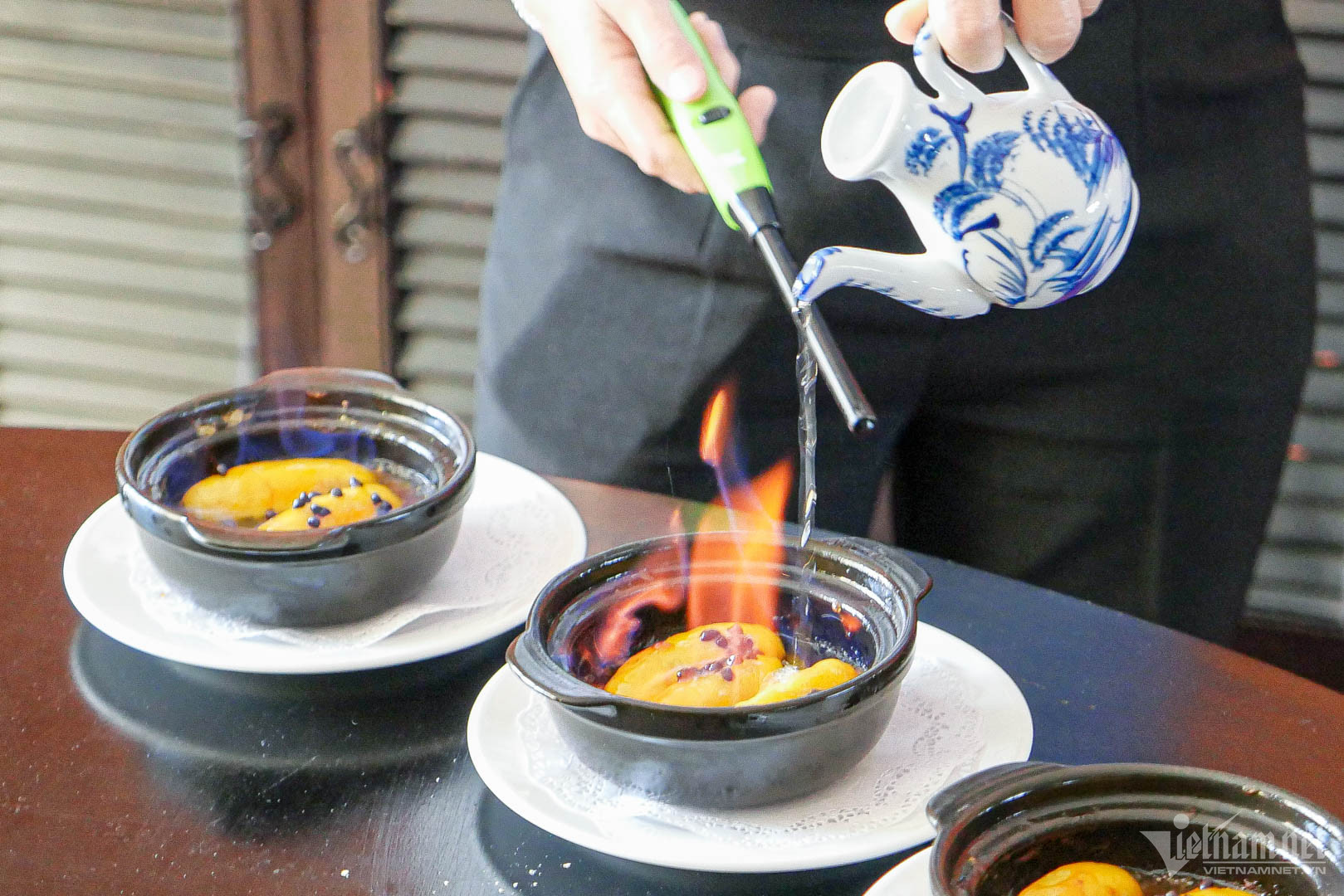 Niêu chuối được bưng ra mời khách khi còn nóng hổi. Lúc này, đầu bếp thực hiện "kĩ xảo". Họ rót lên niêu chuối một lượng rượu vodka nồng độ mạnh rồi đánh lửa. Niêu chuối bắt đầu cháy phập phùng trong khoảng 20 giây, tạo nên hiệu ứng lạ mắt. Cách làm này cũng khiến mùi chuối, nước sốt cam tỏa ra thơm phức, phần vỏ ngoài trái chuối sém lại, càng dậy mùi.