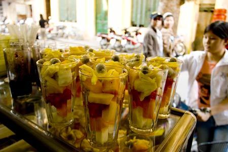Quán nào cũng có hàng chục loại quả bày ngay trên mặt quầy. Quả được cắt thành những miếng nhỏ vừa miệng rồi cho vào cốc. Khách ăn có thể đếm được trên chục loại quả trong cốc của mình nào dưa hấu, xoài, mẵng cầu, bơ, dưa vàng, mít, nhãn, trân châu đen… được xếp theo trình tự màu sắc xanh, đỏ, vàng rất hấp dẫn và bắt mắt.