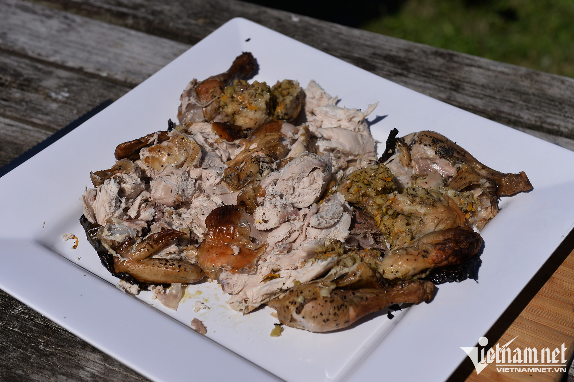 Một con gà được xé thành từng miếng sau khi nướng. Người Maori có quan điểm không cần phải trình bày mang tính thẩm mỹ cho thức ăn ngoài trời kiểu này.