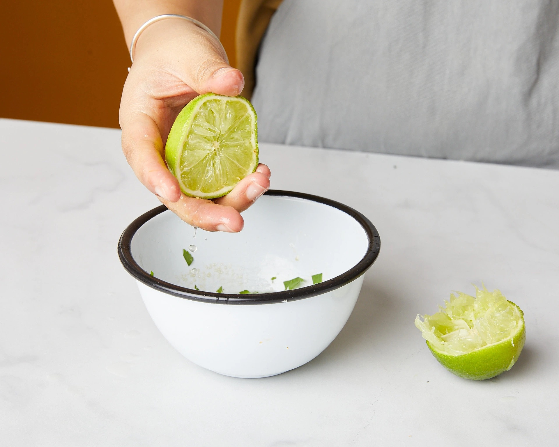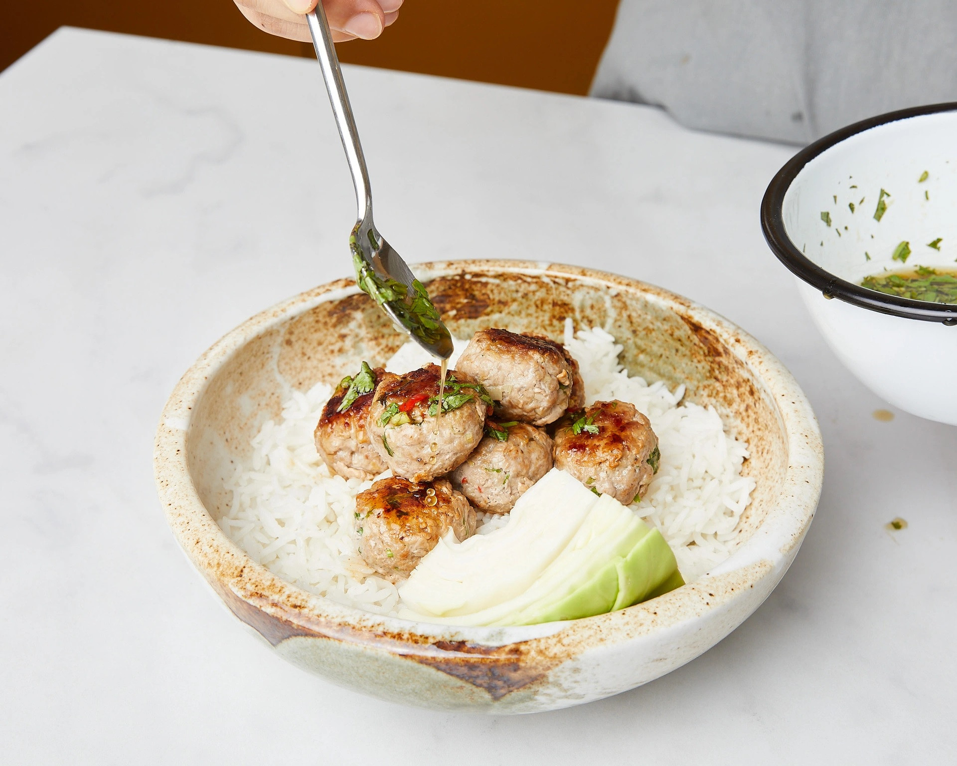 Chuẩn bị tô cơm nóng kết hợp thịt viên, bắp cải và ngò, chanh nếu muốn.