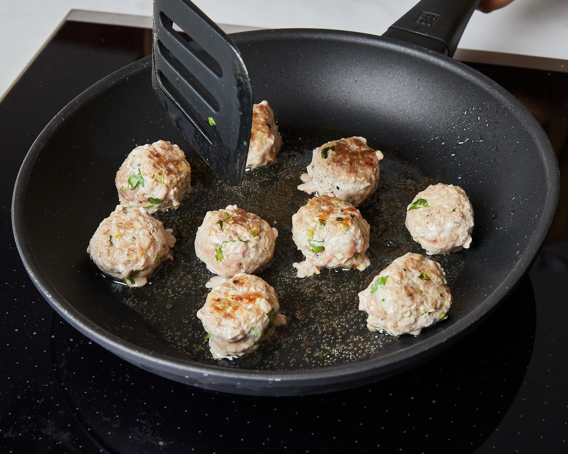 Khi chảo đã nóng, cho thịt viên vào. Chiên một mặt cho đến khi vàng nâu, sau đó lật nhẹ.
