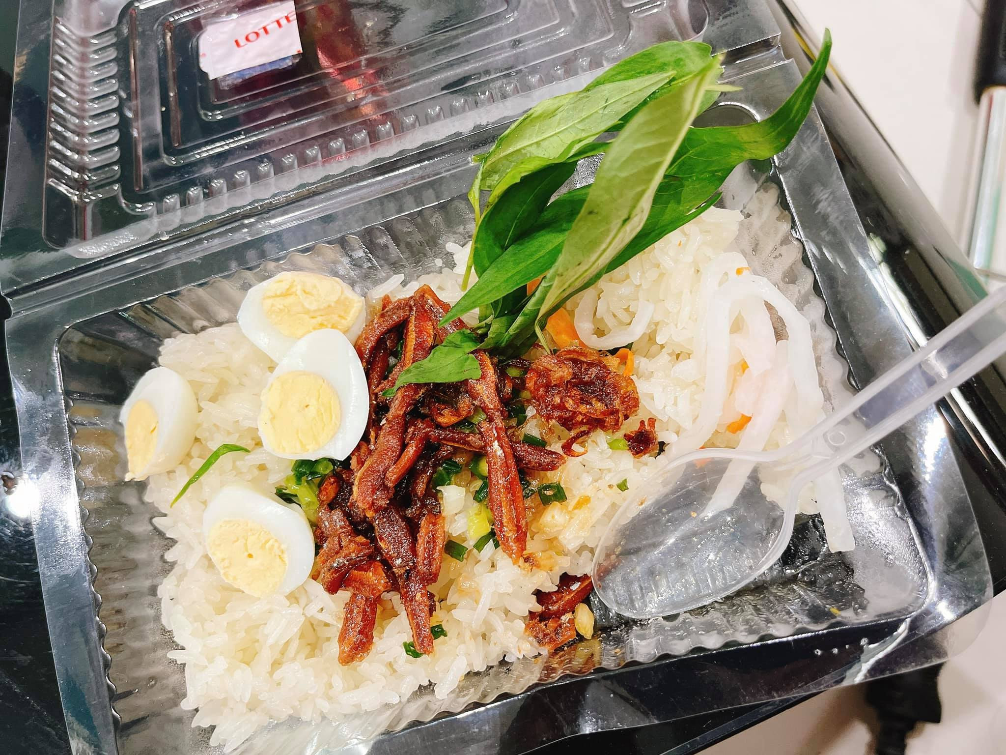 Khi có khách mua, người bán sẽ đơm xôi vào hộp, thêm lớp cá cơm rim, rưới chút nước sốt và một ít hành phi, trứng cút, mỡ hành nóng. Phần xôi dẻo mịn, dậy mùi thơm ăn kèm với cá cơm rim mặn cùng chút nước sốt, trứng cút và mỡ hành béo ngậy khiến bất kỳ ai cũng thích.