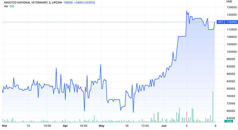 Chốt phiến giao dịch 3/6, giá cổ phiếu VET giao dịch ở mức 116.000 đồng/cp, tăng 8,82%. Trong các phiên gần đây, cổ phiếu này tăng mạnh từ mức 89.000 đồng/cp (31/5) lên 95.100 đồng/cp (1/6) và đang ở mức cao nhất 116.000 đồng/cp. Tính từ 19/5 đến nay, cổ phiếu này đã tăng 62%.