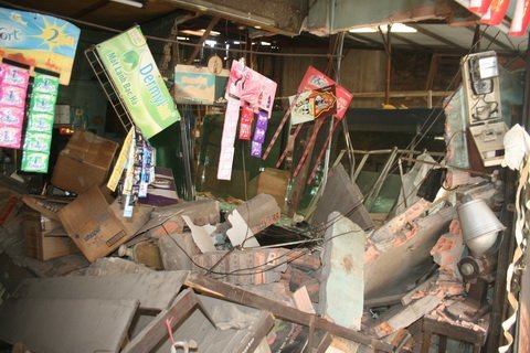 | Bức tường tiệm tạp hóa bị vỡ chôn vùi nhiều hàng hóa |