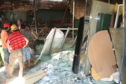 | Các mảnh vỡ và tấm kính còn nguyên nằm chen nhau bên trong tiệm kính. |