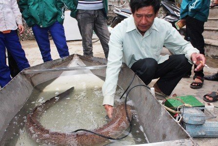 Hiện con cá chình khổng lồ trên đang được ông Tý nuôi tại nhà trong một chiếc thuyền tôn. Sau hơn một ngày nuôi con cá đã khỏe trở lại và vùng vẫy rất mạnh.