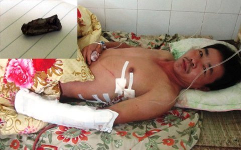 | Anh Nguyễn Mạnh Hùng sau khi được phẫu thuật gắp đầu đạn tại Bệnh viện Đa khoa Nghệ An. |