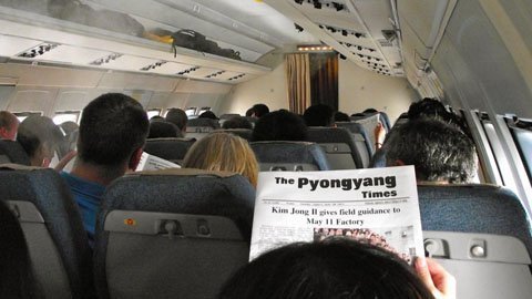 Trên trang nhất của báo được phát trên chuyến bay là hình của lãnh đạo Kim Jong Il |