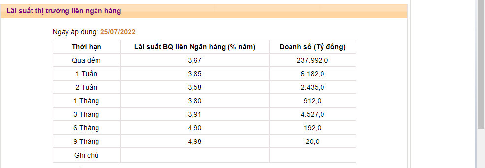 Số liệu được NHNN cập nhật đến ngày 25/7 cho thấy lãi suất VND liên ngân hàng tiếp tục tăng mạnh ở tất cả các kỳ hạn. Cụ thể, lãi suất kỳ hạn qua đêm đã tăng lên 3,67%/năm từ mức 2,8% ghi nhận vào cuối tuần trước và gấp khoảng 10 lần giai đoạn trước khi NHNN mở lại kênh hút tiền qua tín phiếu. Lãi suất các kỳ hạn 1 tuần, 2 tuần, 1 tháng và 3 tháng cũng bật tăng mạnh.