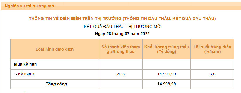 Phiên giao dịch 26/7 chứng kiến diễn biến đáng chú ý trên thị trường tiền tệ khi lãi suất trúng thầu trên thị trường mở (OMO) đã tăng vọt lên 3,8%/năm cho kỳ hạn 7 ngày, từ mức 2,5% trước đó. Đây là lần đầu tiên lãi suất OMO tăng kể từ tháng 9/2020.