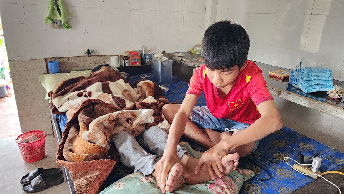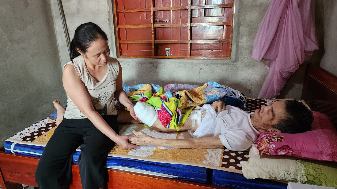 Bất hạnh chưa dừng lại khi giữa năm 2022, bố chồng chị là ông Trần Thanh Sắc (SN 1952) bị tai biến. Di chứng để lại khiến ông bị liệt, không nói được. Mới đây, chân trái của ông bị hoại tử, phải cắt bỏ. Tuổi cao, sức yếu lại thêm bệnh tật hành hạ, ông Sắc sống cảnh thực vật. Chi phí bỉm, bông băng cho ông gần 100.000 đồng/ngày. Trong khi đó, mẹ chồng chị Sáu đi lại khó khăn, vậy nên mọi hoạt động thường ngày của bố chồng đều trên tay chị.