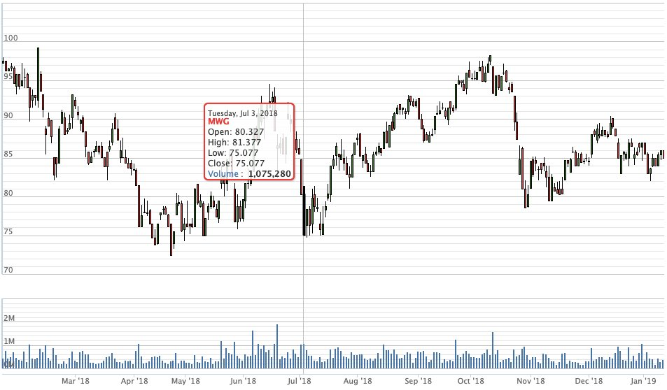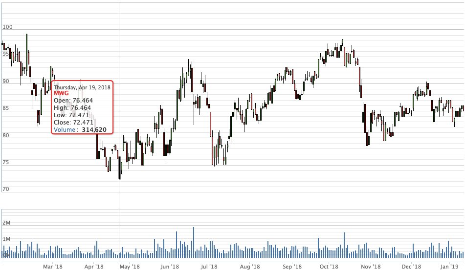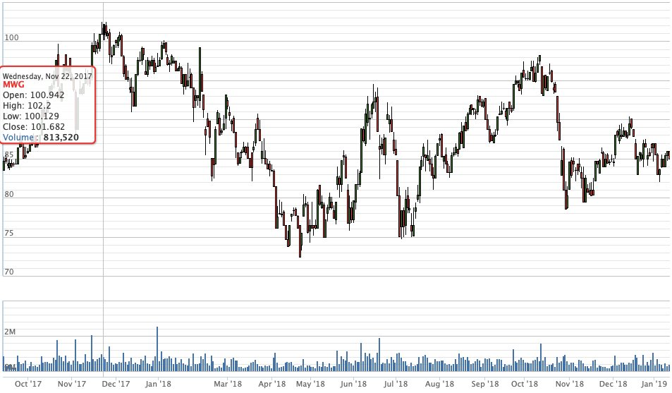 Nhìn vào biểu đồ giá kể từ khi niêm yết đến nay, có thể thấy mã MWG cực đẹp khi liên tục tăng giá đều đặn từ giữa năm 2014 và đạt mức cao nhất vào cuối năm 2017. Năm 2015 cổ phiếu này không tăng nhưng giao động giá nhẹ nhàng. MWG đạt đỉnh vào cuối năm 2017 và sau đó chứng kiến sự dao động bất ngờ trong suốt năm 2018, kéo dài cho đến thời điểm hiện tại. Kể từ sau sự cố bị “vu oan” làm lộ thông tin khách hàng, mã MWG vẫn đang gượng dậy, chưa đạt mức giá cao từng thiết lập trước đó một tháng.