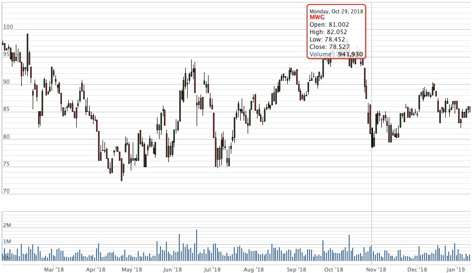 Lần biến động gần đây nhất xảy ra vào tháng 10/2018. MWG đạt mức gần như cao nhất trong năm, 98.252 đồng/CP vào ngày 10/10, nhưng sau đó đột ngột giảm giá không phanh, xuống 78.527 đồng/CP vào ngày 29/10. Sau khi gượng dậy được vài ngày thì hôm 7/11, Thế Giới Di Động bị “vu oan” vụ để lộ thông tin khách hàng khiến cổ phiếu giảm lại. Mặc dù MWG đang tăng trở lại nhưng mốc giá có được hồi tháng 10 chắc chắn cần thêm thời gian mới đạt được.