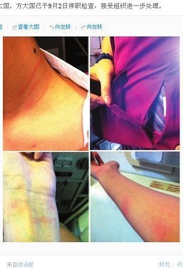 Zhou Yumeng, tiếp viên của hãng China Southern Airlines, đã đăng những bức ảnh lên trang Sina Weibo - một mạng xã hội giống như Twitter phổ biến tại Trung Quốc - cho thấy các vết thương do ông Fang gây ra.