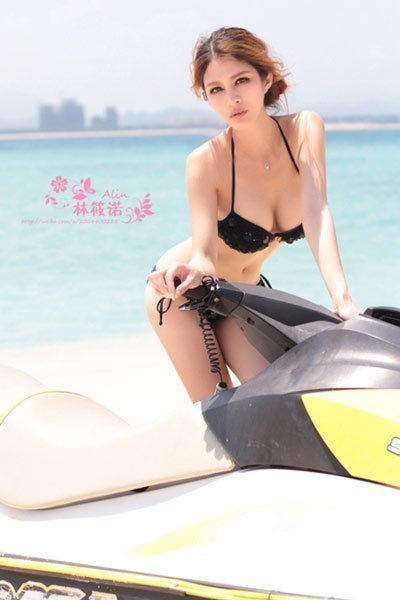 Bên bờ biển xanh, mây trắng, nắng vàng, người đẹp tha hồ khoe đường cong quyến rũ bên một chiếc mô tô lướt nước.