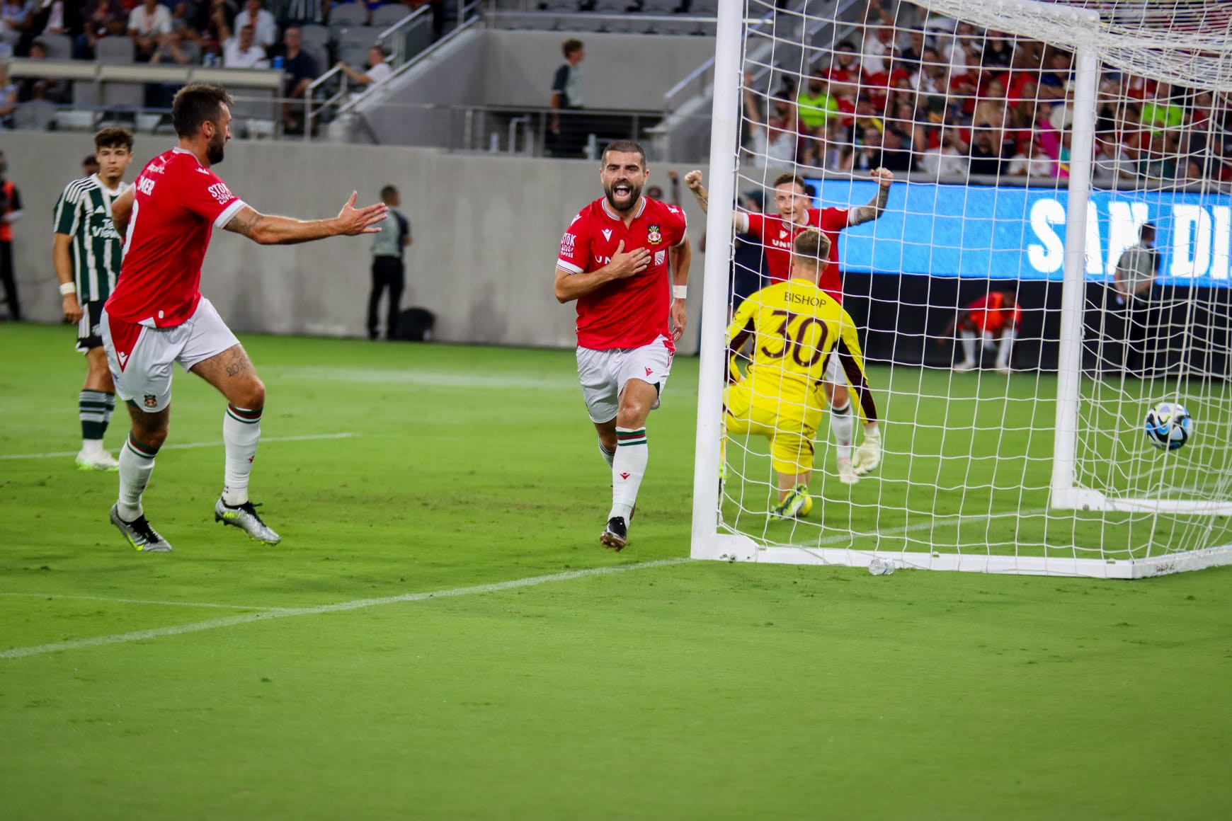 MU tung ra sân đội hình gồm toàn cầu thủ trẻ, trừ Jonny EvansJurado xuất phát bên hành lang cánh phảiHannibal cầm trịch tuyến giữa MUPhút 29, Elliott Lee mở tỷ số cho Wrexham Niềm vui của cầu thủ WrexhamAaron Hayden đánh đầu nhân đôi cách biệtMarc Jurado gỡ lại 1 bàn cho MU cuối hiệp 1Sang hiệp hai, MU chỉ còn thi đấu với 10 người từ phút 47 khi Gore bị truất quyền thi đấuDalby ấn định chiến thắng 3-1 cho WrexhamCác cầu thủ trẻ MU nhận thất bại muối mặt