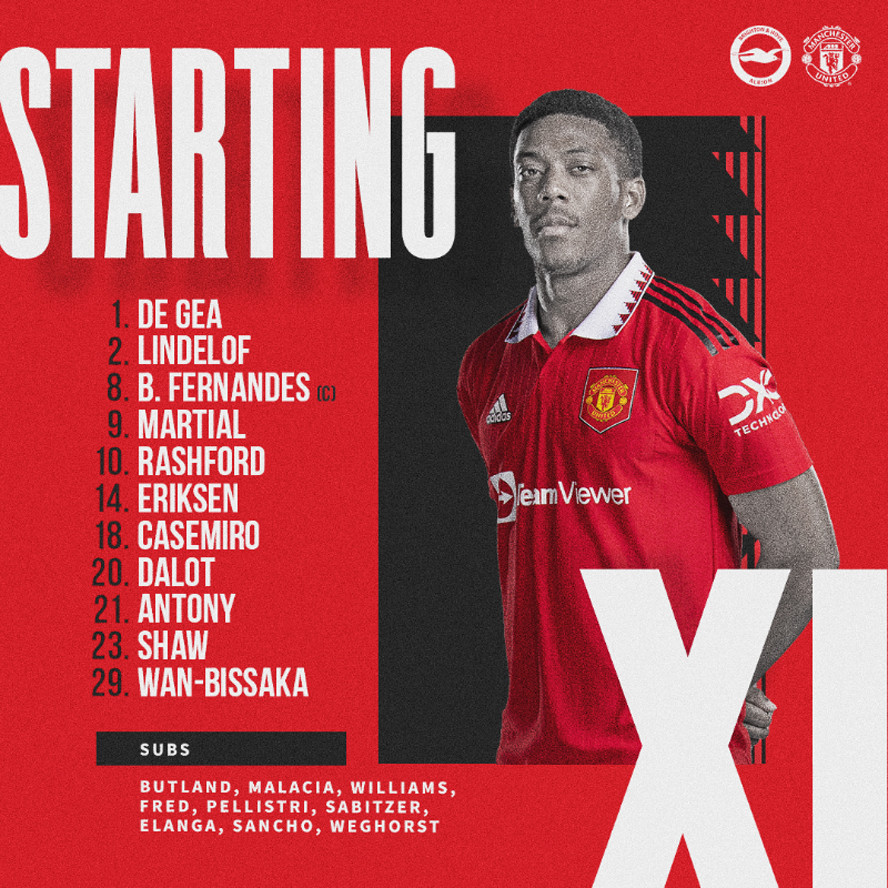 MU: De Gea; Wan-Bissaka, Lindelof, Shaw, Dalot; Casemiro, Eriksen; Antony, Fernandes, Rashford; Martial.