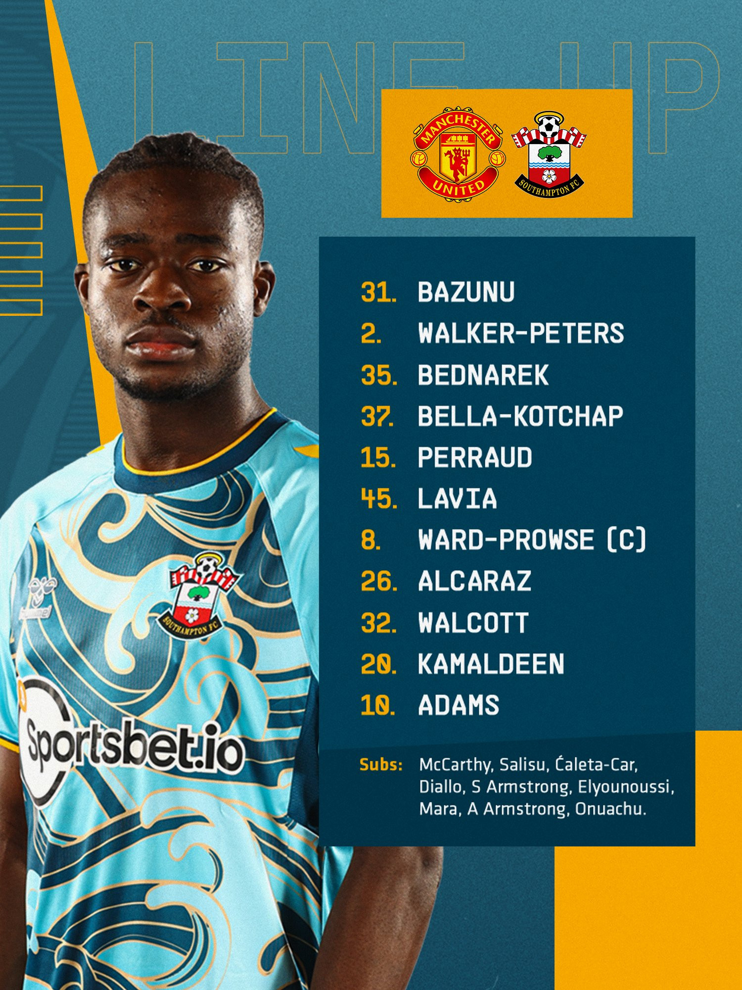 Southampton: Bazunu; Perraud, Bella-Kotchap, Bednarek, Walker-Peters; Ward-Prowse, Lavia; Walcott, Alcaraz, Sulemana; Adams.