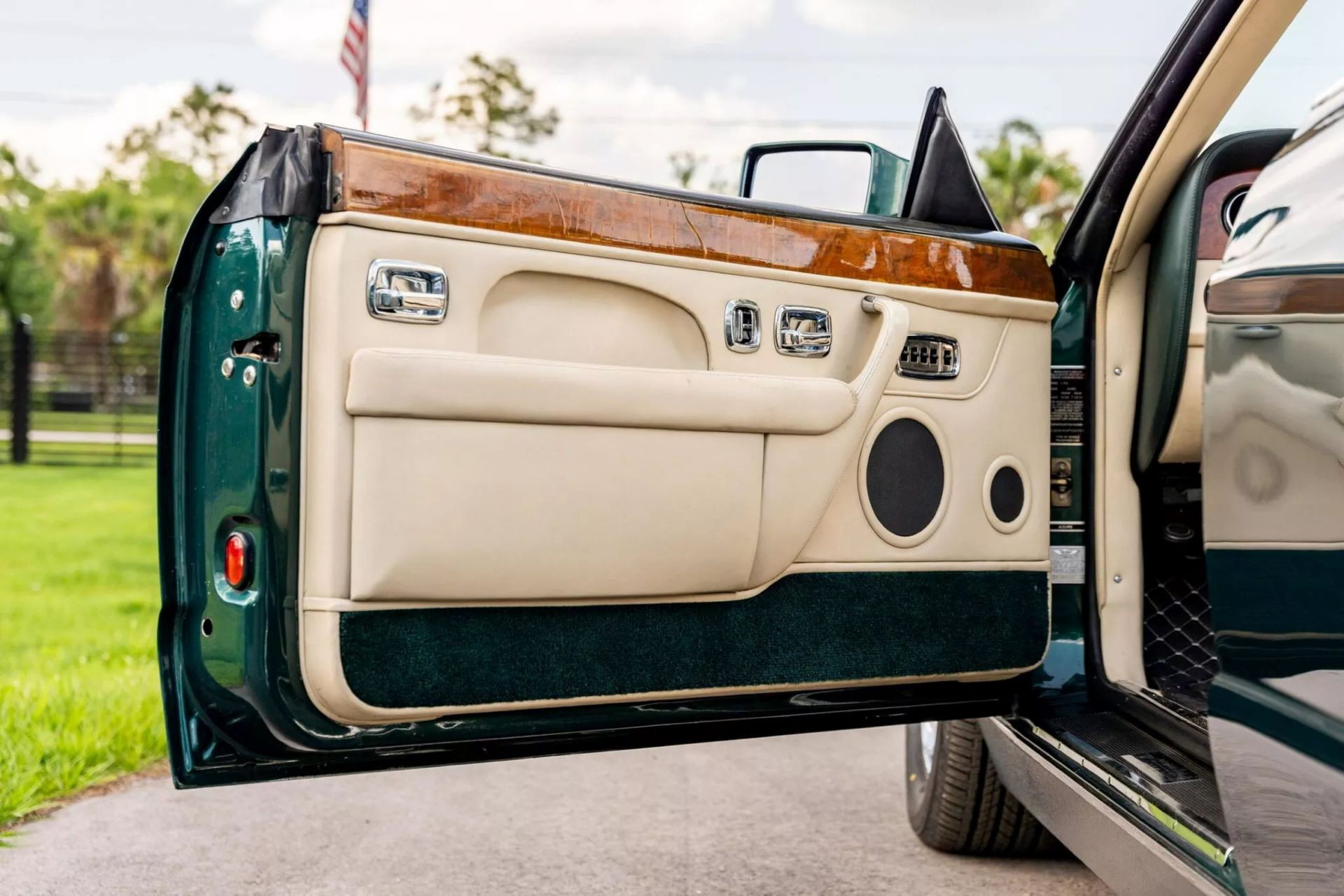Phải công nhận, chiếc Bentley Azure này vẫn giữ được khí chất quý tộc: thân xe sơn màu xanh lục quý phái, cổ điển kết hợp nội thất da màu be, mui xếp điều khiển điện và những đường nét thiết kế không thể nhầm lẫn với bất kỳ thứ gì ngoài một Bentley "thuần chất". Gỗ thật được khảm khắp cabin, toát lên phong thái thủ công đặc trưng của Crewe - đại bản doanh của Bentley.