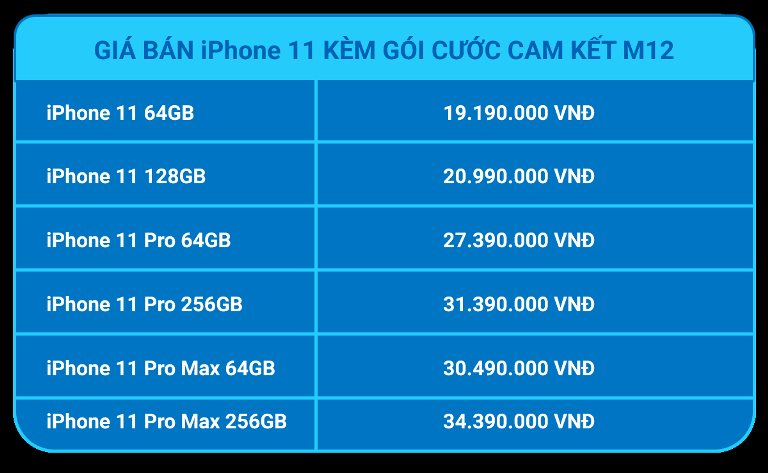 Đối với với gói cước M12, các thuê bao trả trước hòa mạng mới, thuê bao MNP chuyển mạng thành công sang MobiFone sẽ được mua các dòng iPhone 11 với mức giá từ 19.190.000 đồng và sẽ được hưởng 200 phút thoại nội mạng MobiFone, 1 GB data truy cập Internet/tháng).