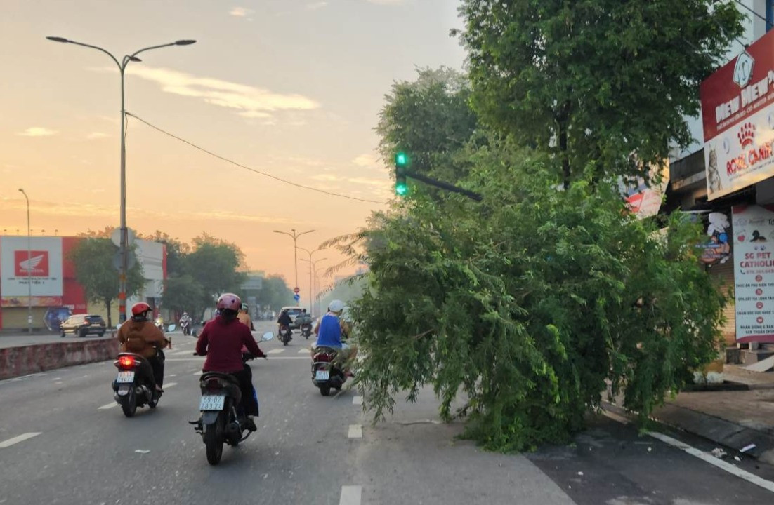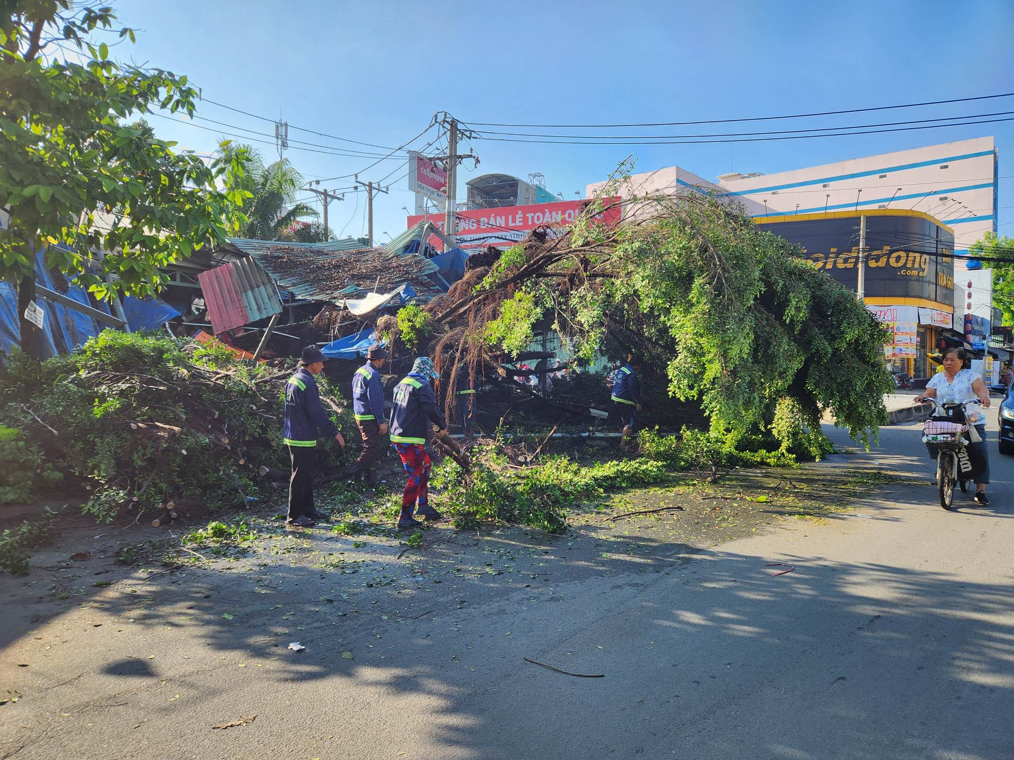 Hàng cây xanh, biển hiệu bị xô ngã đổ xuống đường.