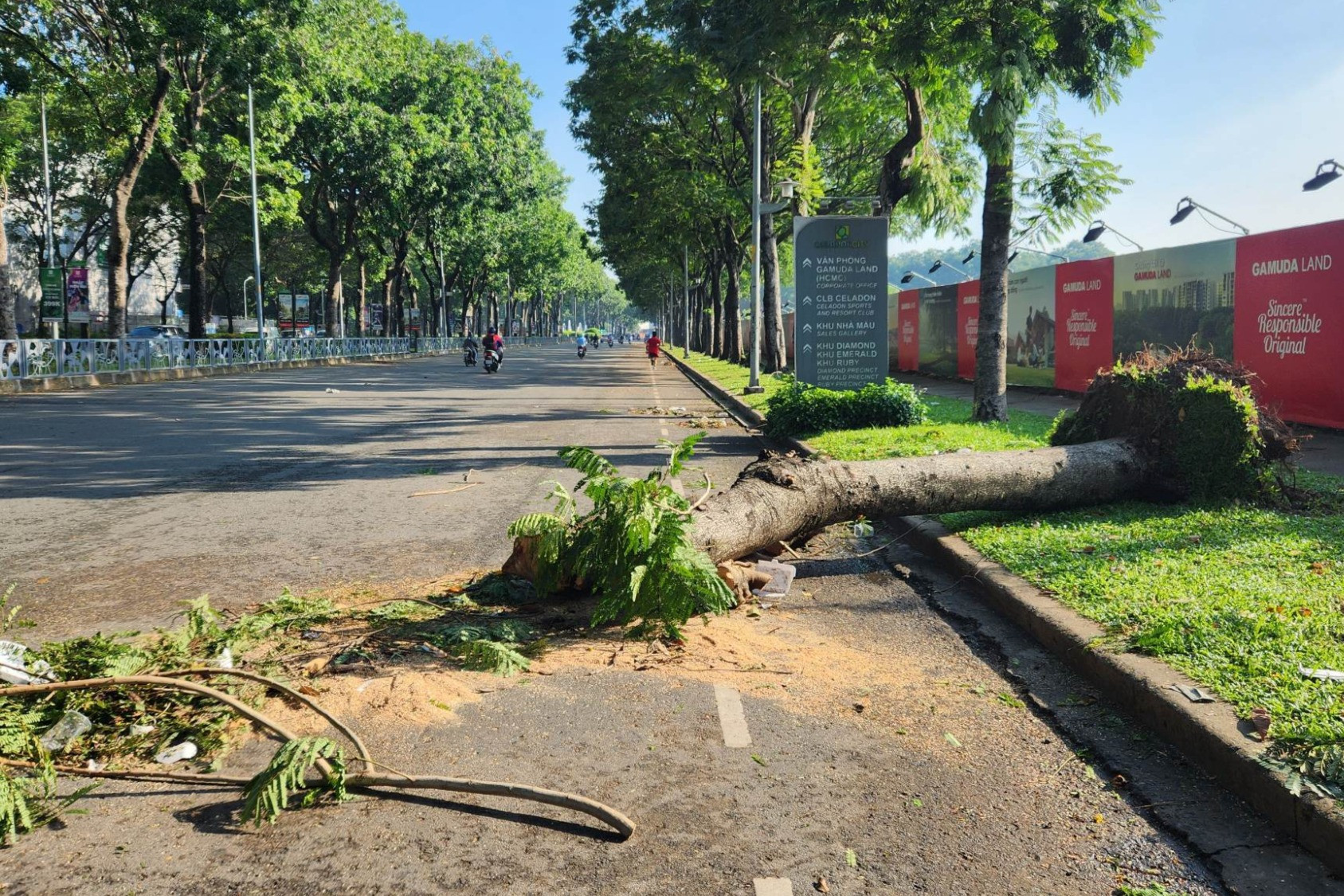 Đến sáng 23/6, cây xanh ngã đổ trên các tuyến đường TP.HCM vẫn còn ngổn ngang. Nhân viên cây xanh đô thị vẫn đang dọn dẹp, khắc phục. Ảnh: MLTrong đêm, cây xanh có đường kính gần 40cm bật gốc ngã ra đường đường D2 (khu Celadon, quận Tân Phú). Ảnh" MLCây xanh ngã ra đường gây cản trở giao thông. Ảnh: ML