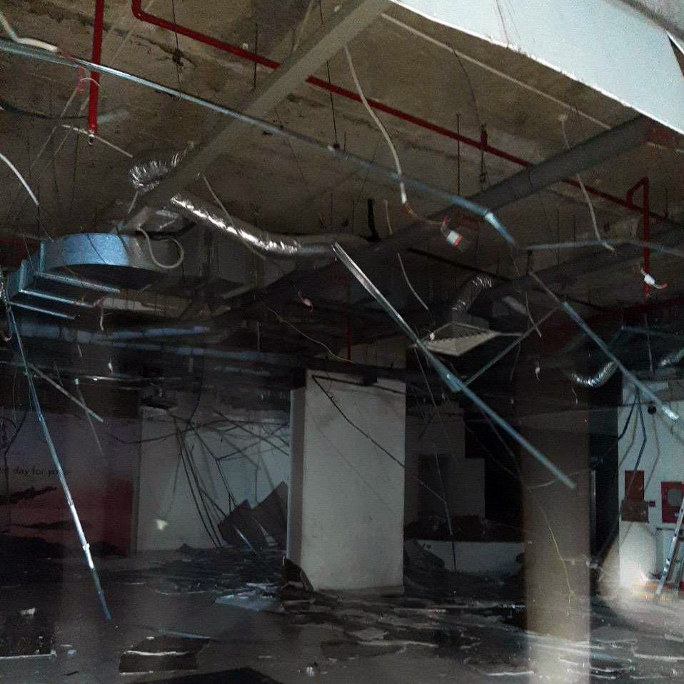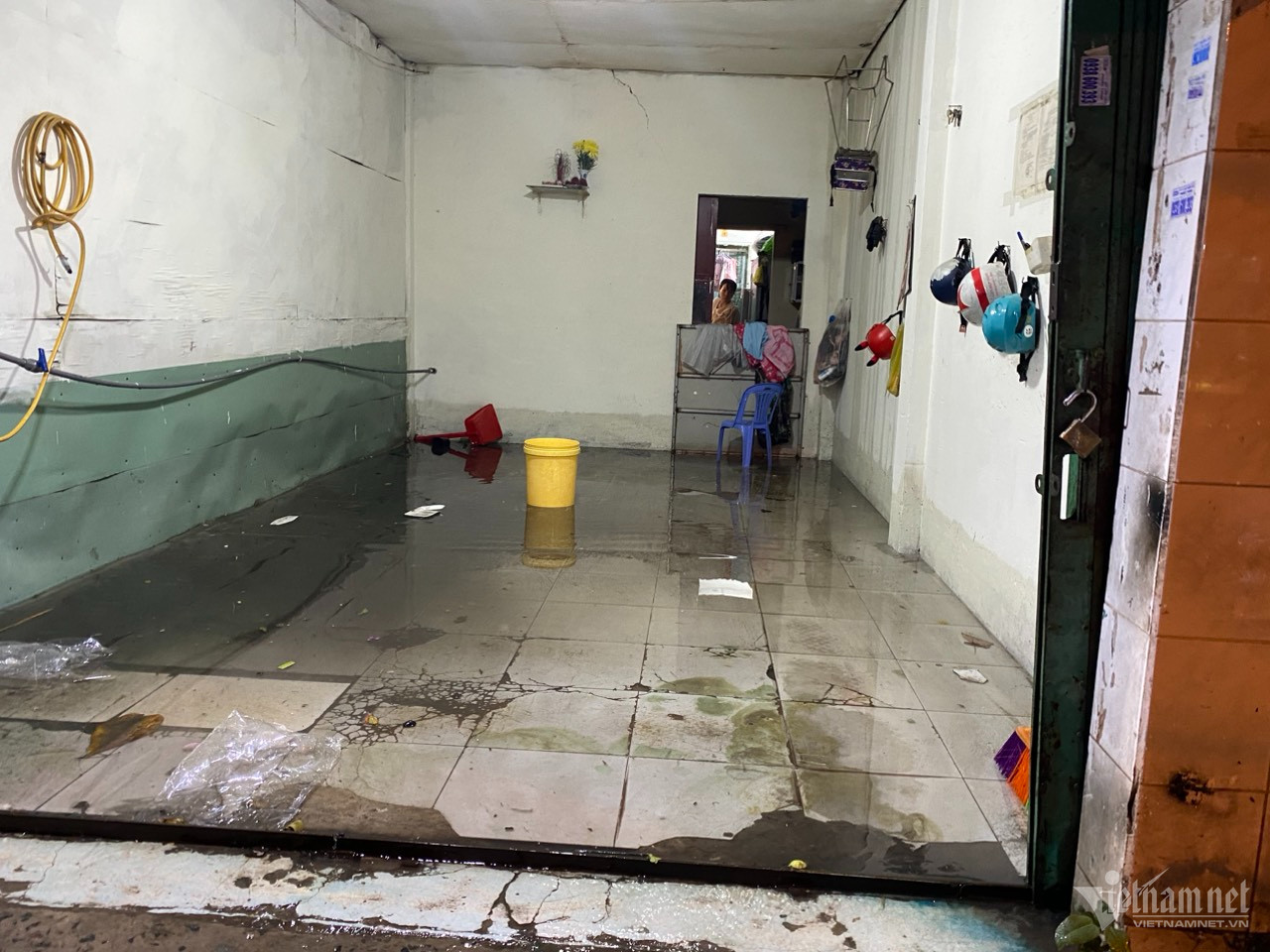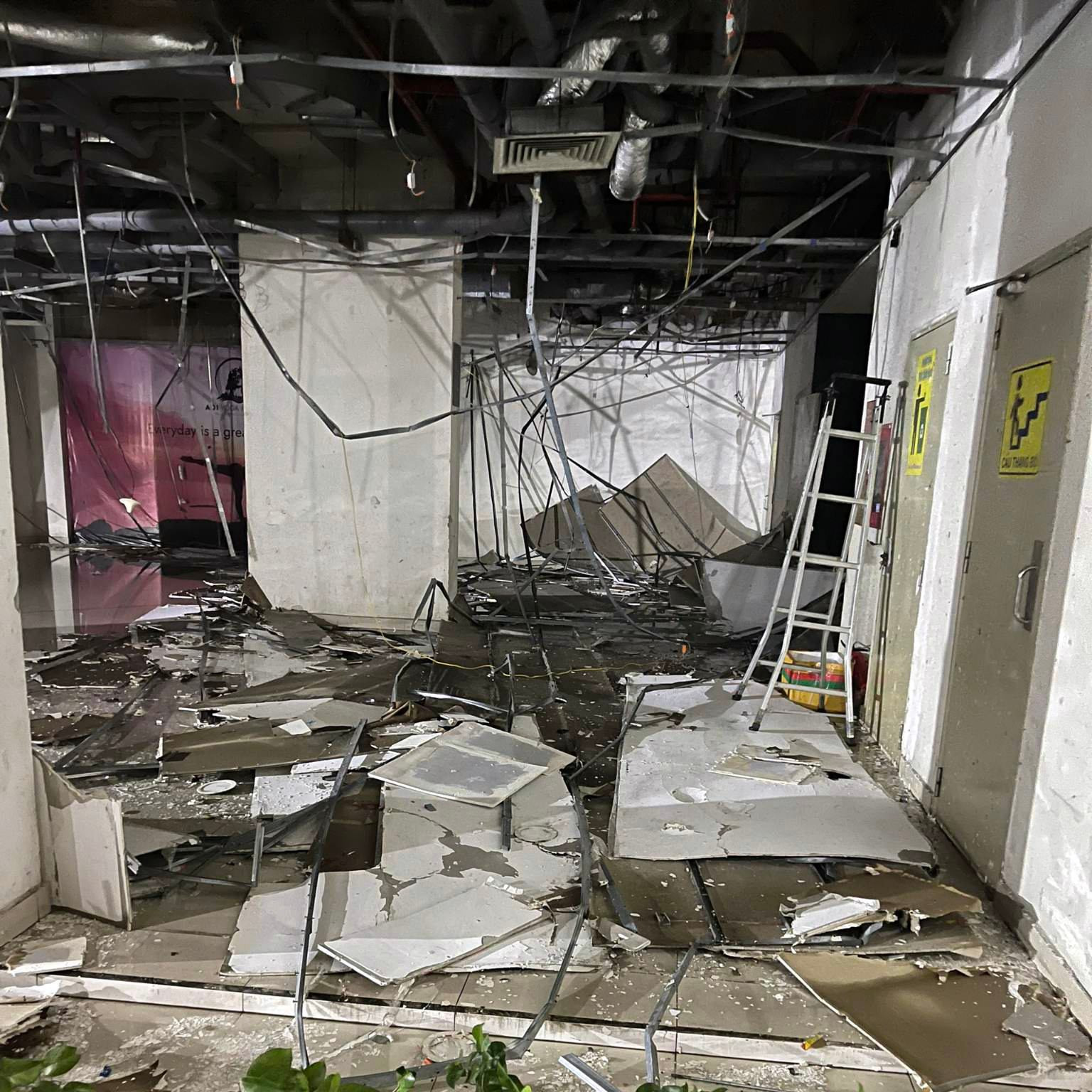 Mưa kèm giông lốc tối qua làm trần thạch cao ở tầng trệt của một chung cư ở quận Bình Tân bị hư hỏng nặng. Ảnh: DT