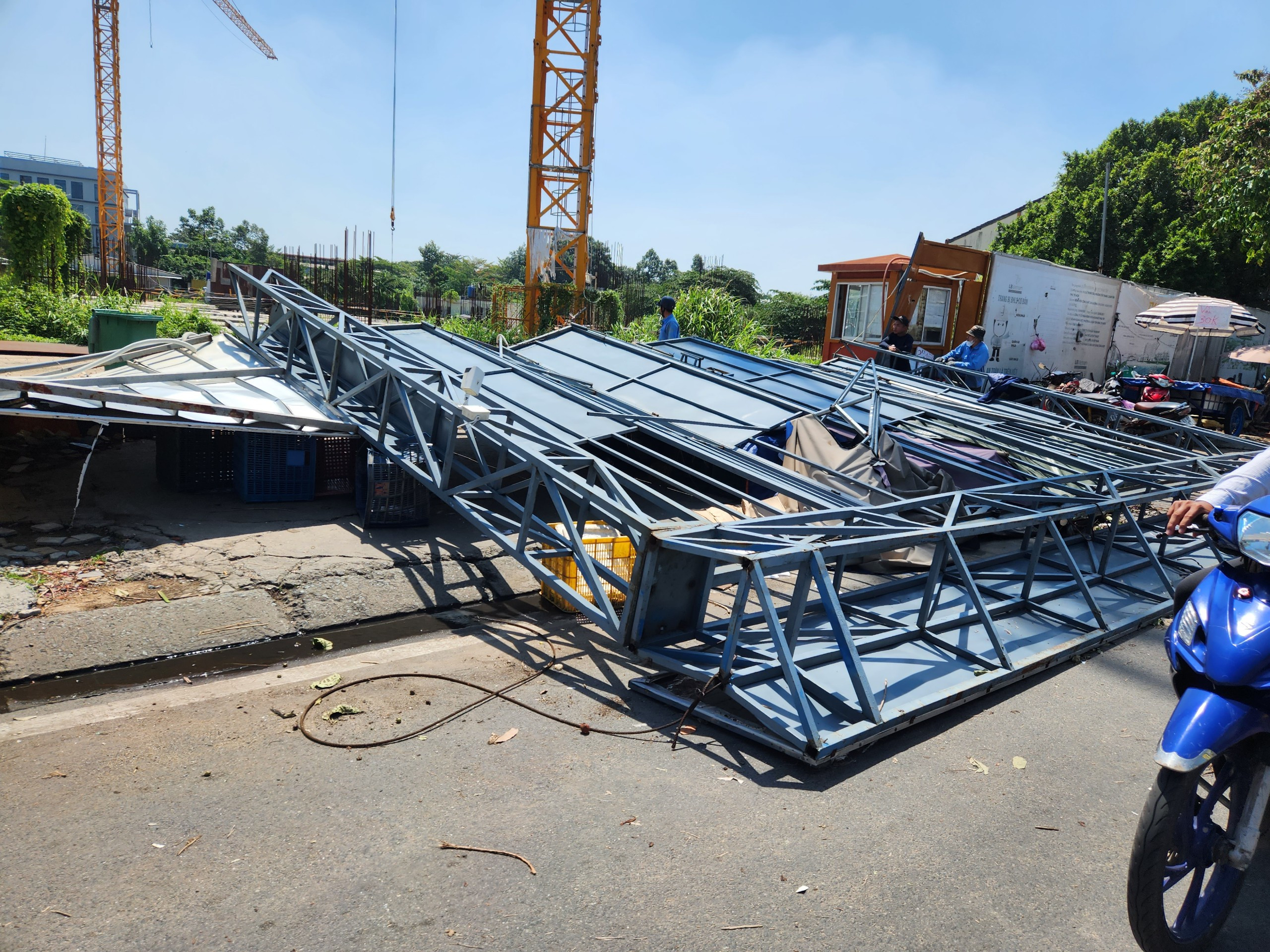 Khung sắt của cổng dự án xây dựng trên đường Lê Trọng Tấn (phường Sơn Kỳ, quận Tân Phú) bị giông lốc giật ngã xuống đường đêm qua. Ảnh: MLSáng nay, khung sắt có đường kính gần 8m, cao 6m cùng rào chắn xung quanh nặng hàng tấn đổ ập xuống đường vẫn chưa được di chuyển. Ảnh: MLTheo báo cáo của Trung tâm Quản lý Hạ tầng kỹ thuật TP.HCM (thuộc Sở Xây dựng), từ 20h50-23h tối qua (22/6) trên địa bàn TP có mưa trên diện rộng. Con mưa làm 15 tuyến đường bị ngập sâu từ 0,10-0,25m.Các tuyến đường ngập sâu tại TP Thủ Đức có như Quốc lộ 13, Hiệp Bình, Nguyễn Duy Trinh, Quốc Hương, Đỗ Xuân Hợp; quận Gò Vấp có đường Nguyễn Văn Khối, Phạm Văn Chiêu, Lê Đức Thọ, Lê Văn Thọ; quận 12 có đường Phan Huy Ích, Phan Văn Hớn, Nguyễn Văn Quá, Song hành Quốc lộ 22; quận Tân Phú có đường Cầu Xéo, Tân Kỳ Tân Quý.Nước tràn vào nhà dân khiến đời sống sinh hoạt của người dân bị ảnh hưởng.