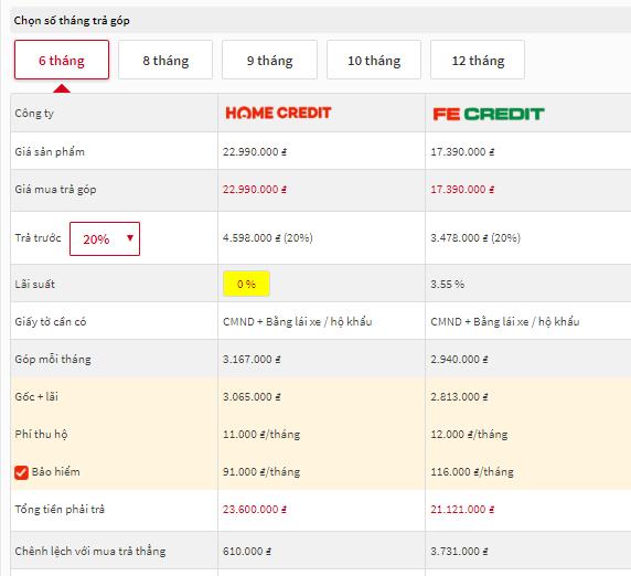 Hai là dùng dịch vụ của Fe Credit lãi suất 3.55%/tháng và giá sản phẩm là giá được khuyến mại nên chỉ còn 17,4 triệu đồng. Sau khi cộng các loại phí và lãi suất thì sau 6 tháng bạn chỉ phải trả 21,1 triệu đồng. Như vậy, giá chiếc điện thoại này khi mua trả góp 0% còn cao hơn trả góp 3.55%/tháng tới gần 2,5 triệu đồng.