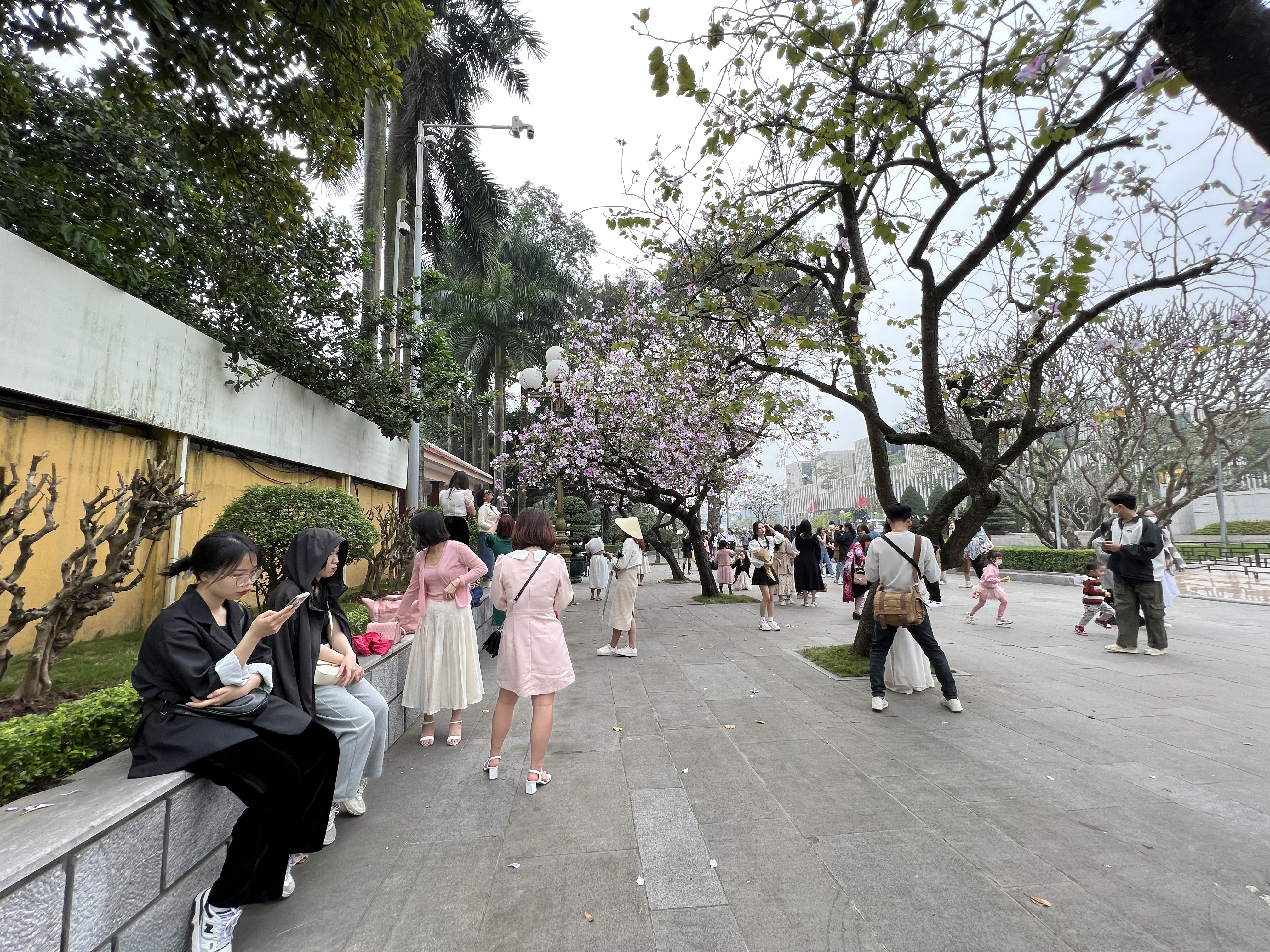 Chị Tuyết Trần (Hà Nội) tranh thủ ngày nghỉ ngơi, đưa các bạn nhỏ trong nhà cùng đi ngắm hoa, chụp ảnh. Nhà chị Tuyết ngay ở khu vực này, nên khi thấy hoa bắt đầu nở, chị cùng gia đình đã rủ nhau đi luôn. Ảnh: Tuyết TrầnHàng phong linh khá thấp, giúp mọi người dễ dàng có được nhiều góc ảnh đẹp. Ảnh: Nhung Dương