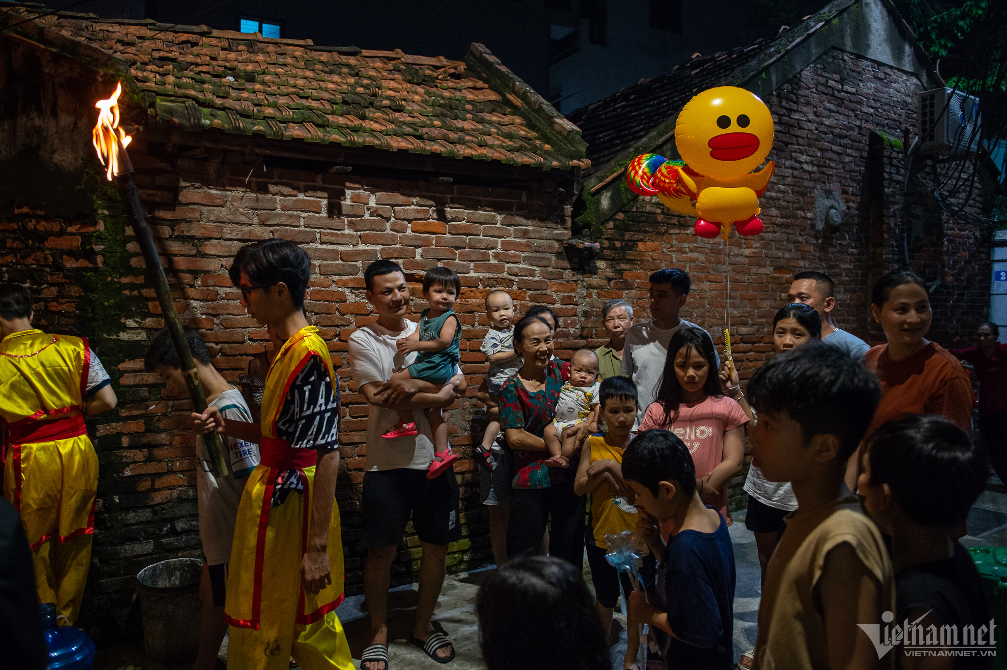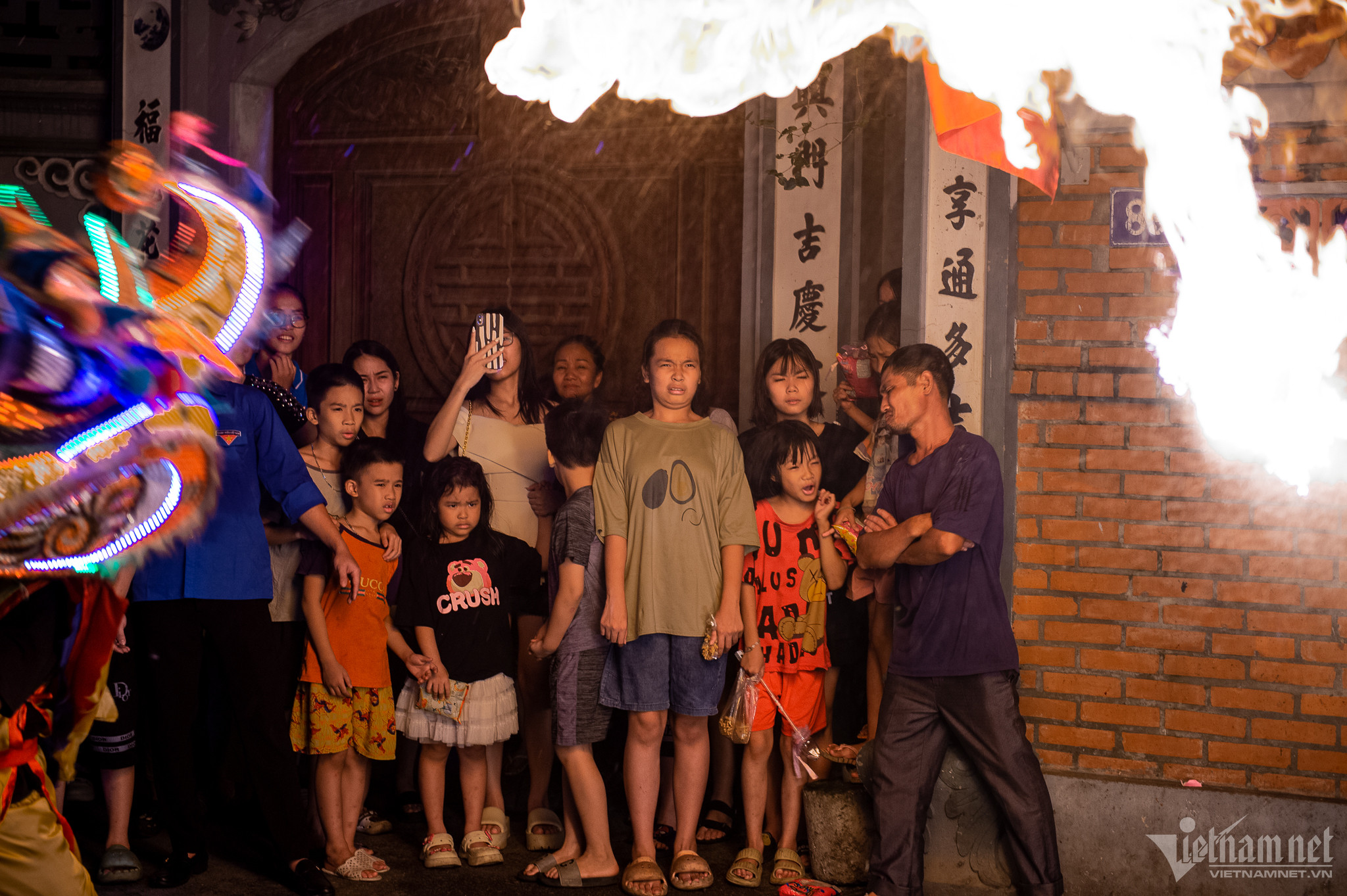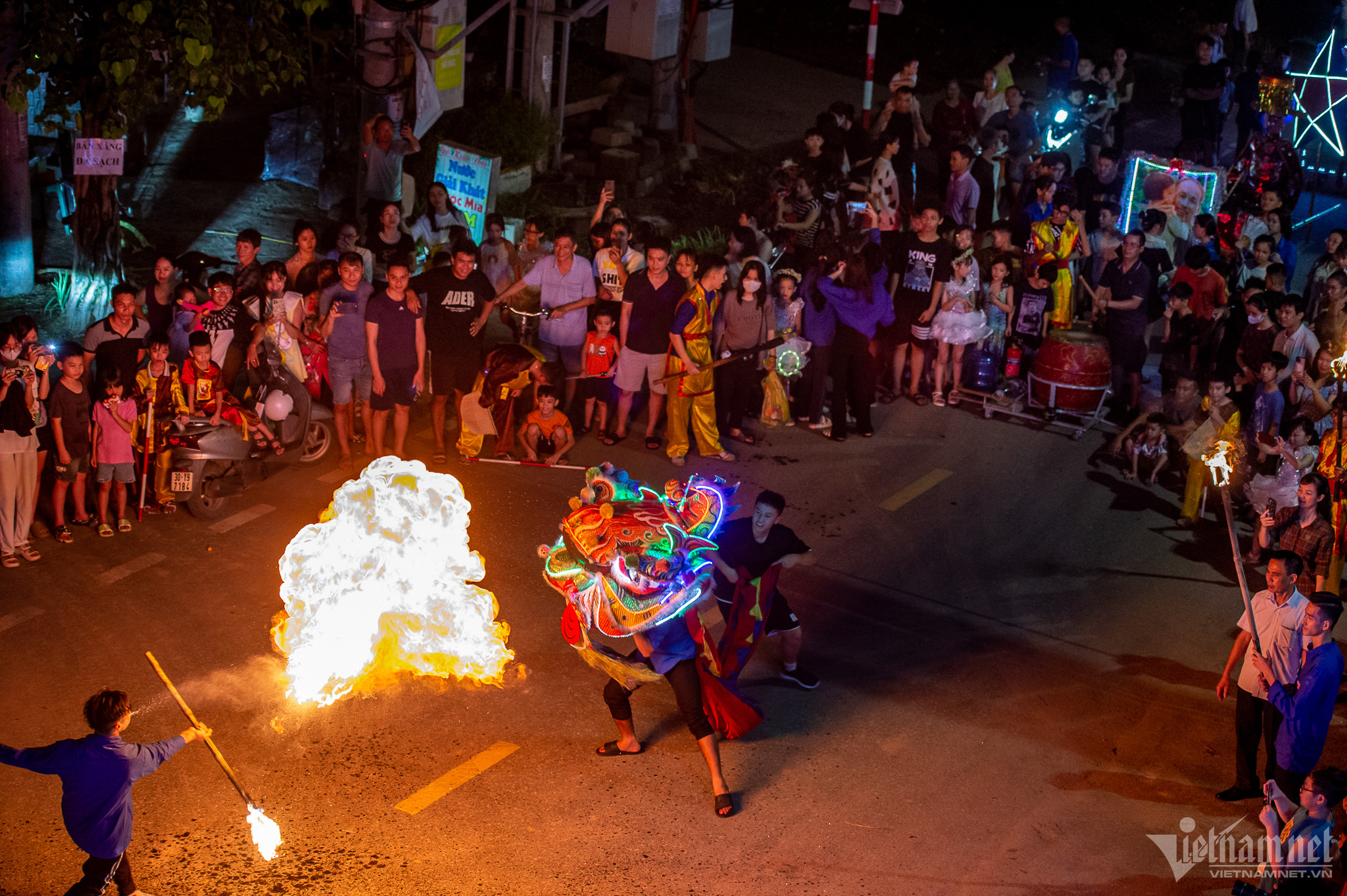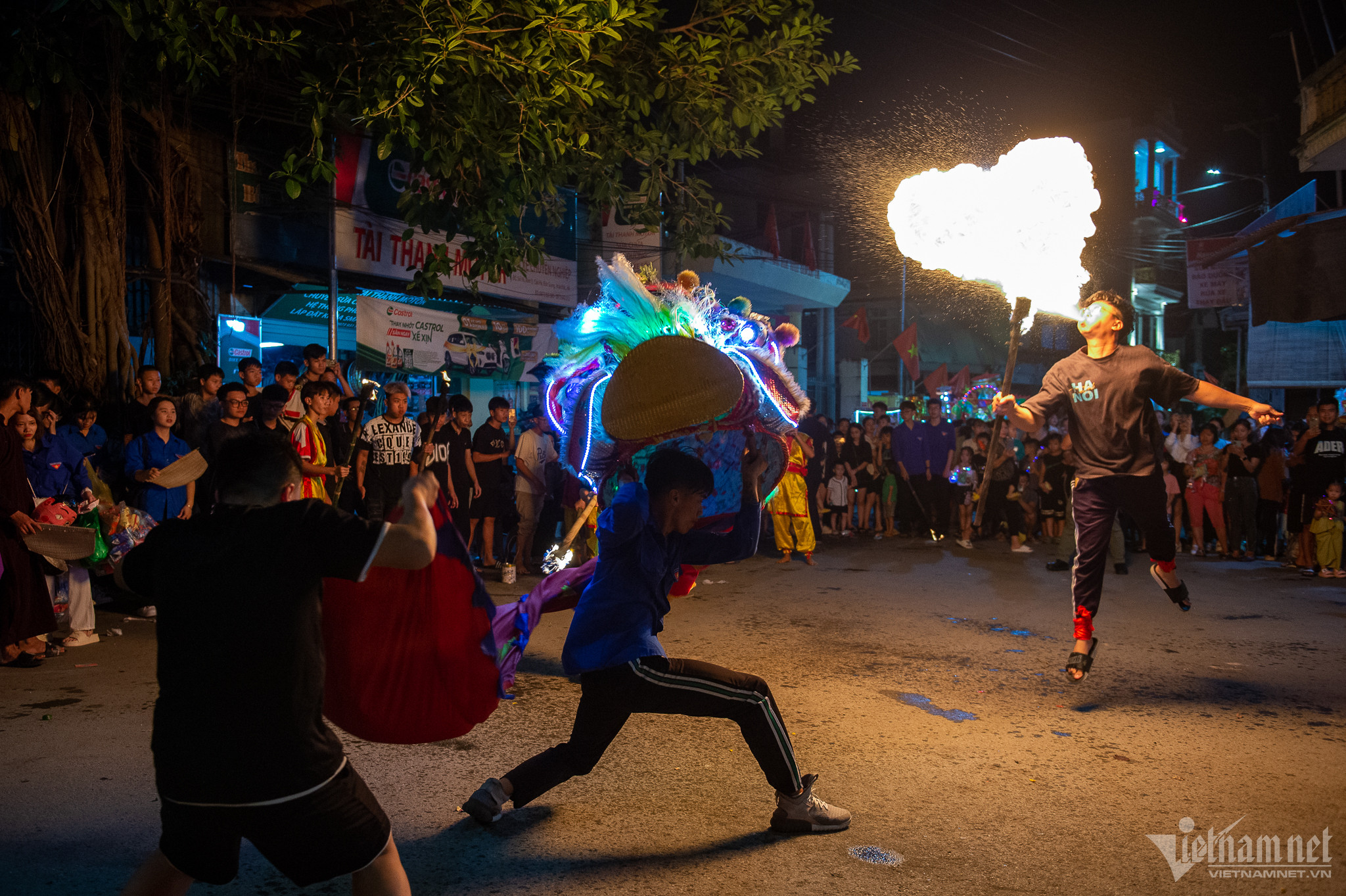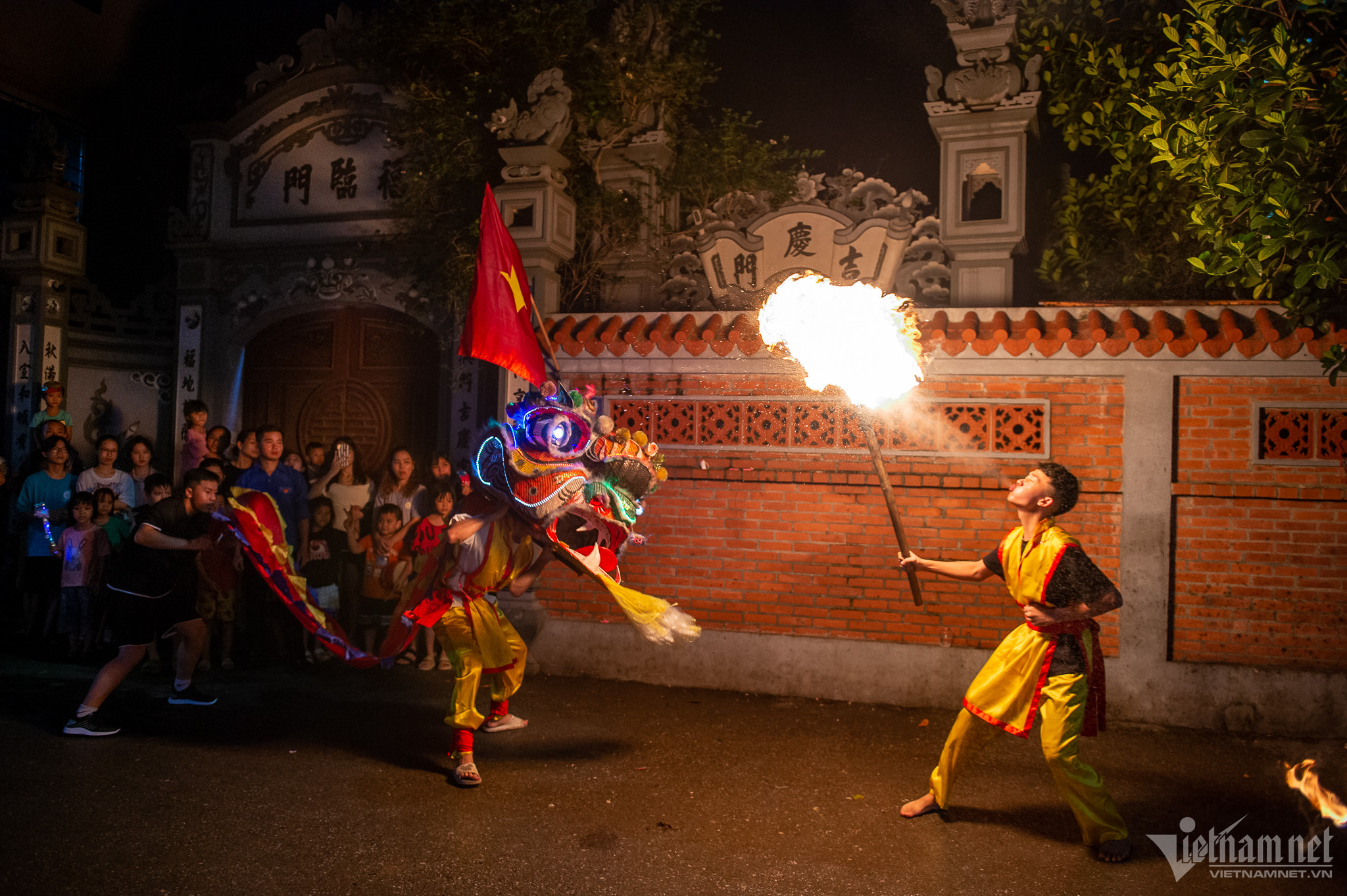 Tối 29/9, không khí Tết Trung thu tại thôn Cao Hạ, Hoài Đức (cách trung tâm Hà Nội khoảng 20km) rất sôi động với những tiết mục múa lân. Đường làng, ngõ xóm rực sáng với những màn thổi lửa trong đêm hội trăng rằm.