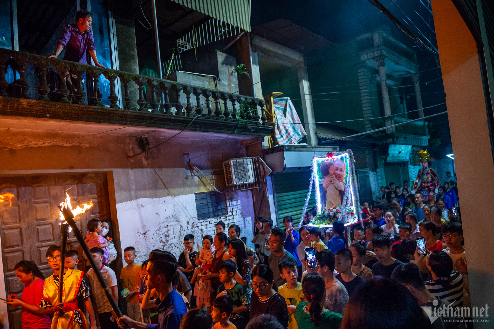 Trong hơn 3 tiếng, đội lân sư và đoàn rước đèn đi khắp con đường trong thôn để phục vụ mọi người.